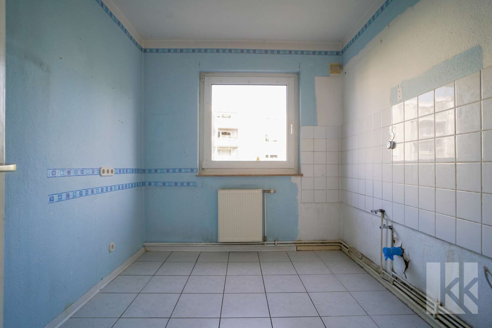 Die separate Küche verfügt über ein Fenster und bietet ausreichend Platz für eine schöne Einbauküche. Das Tageslicht-Badezimmer ist mit Dusche, Waschbecken und WC ausgestattet.