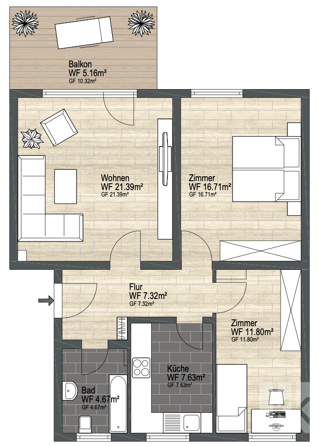 Den Mittelpunkt der Wohnung bildet das großzügige Wohnzimmer mit über 21 m² Wohnfläche. Große Fensterflächen sorgen für eine angenehme Helligkeit und schaffen eine freundliche Wohnatmosphäre. Von hier aus gelangen Sie auf den Balkon, der den Wohnraum sinnvoll nach außen erweitert.