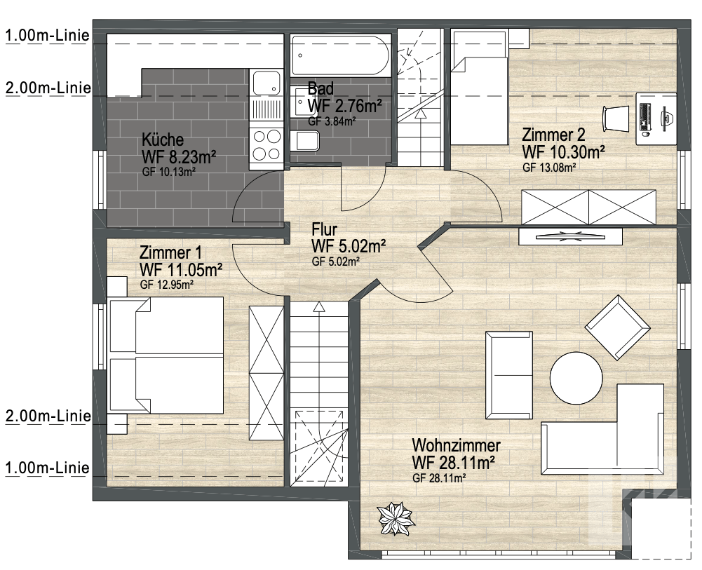 Im Obergeschoss eröffnet sich eine zweite Wohnebene mit vielseitigen Nutzungsmöglichkeiten. Neben einem weiteren Wohnzimmer mit heller, offener Atmosphäre und galerieartiger Fensterfront stehen Ihnen hier eine zusätzliche Küche, zwei flexibel nutzbare Schlafzimmer sowie ein weiteres Badezimmer mit Badewanne und Dusche zur Verfügung. Diese Etage eignet sich besonders gut für größere Familien oder individuelle Wohnlösungen, beispielsweise für Mehrgenerationenwohnen.