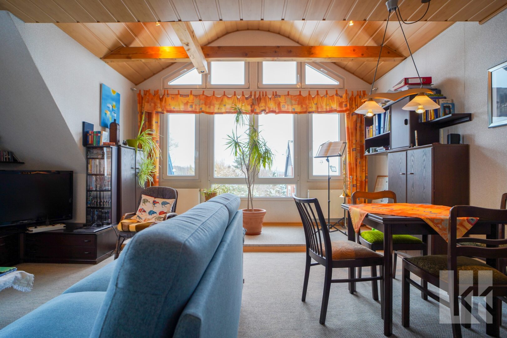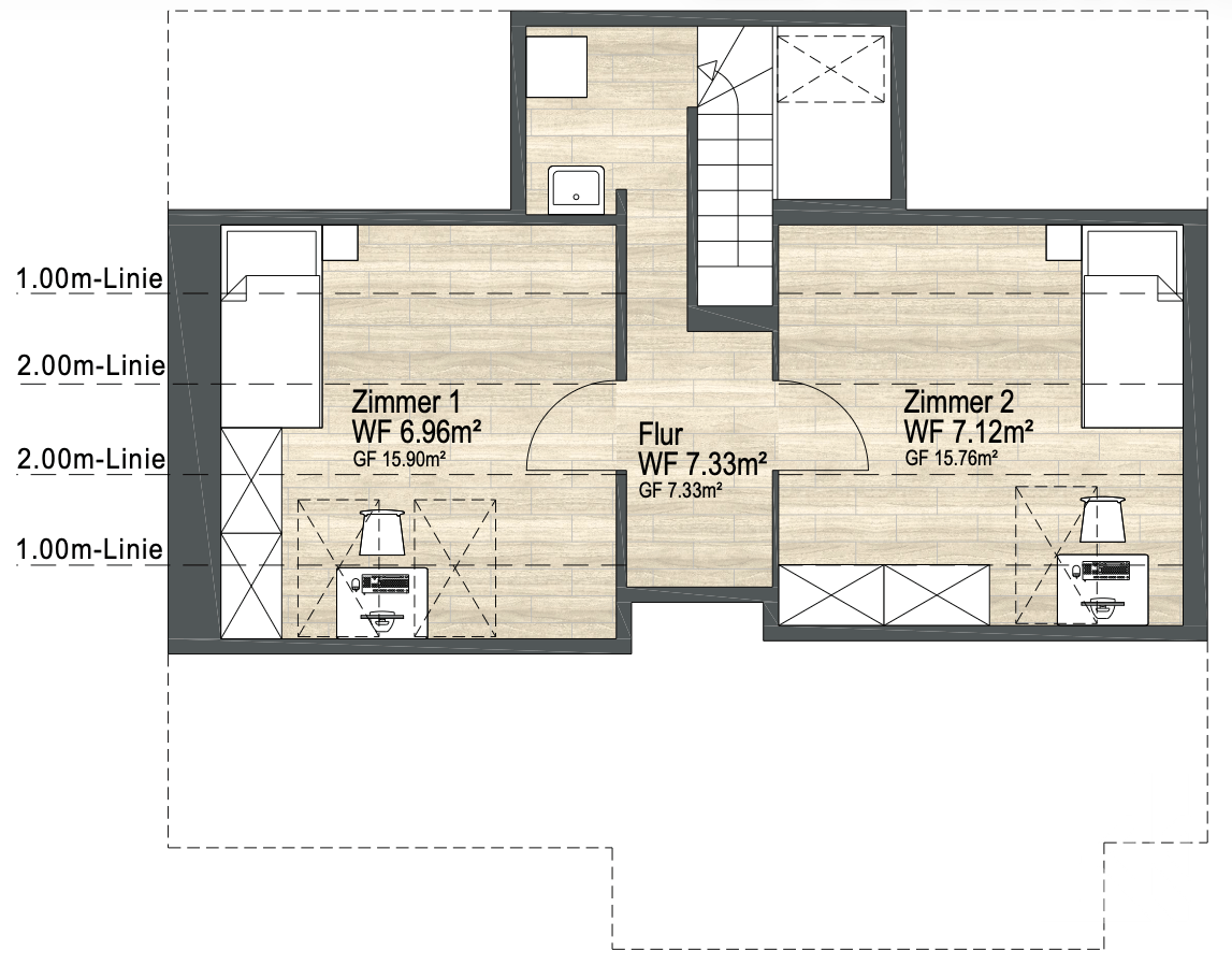 Über eine weitere Treppe gelangen Sie in das Dachgeschoss mit ausgebautem Spitzboden. Hier befinden sich ein großzügiges Zimmer, das sich ideal als Kinderzimmer oder zusätzlicher Wohnraum anbietet, sowie ein weiteres Zimmer, das sich gut als Homeoffice oder als Rückzugsort nutzen lässt.