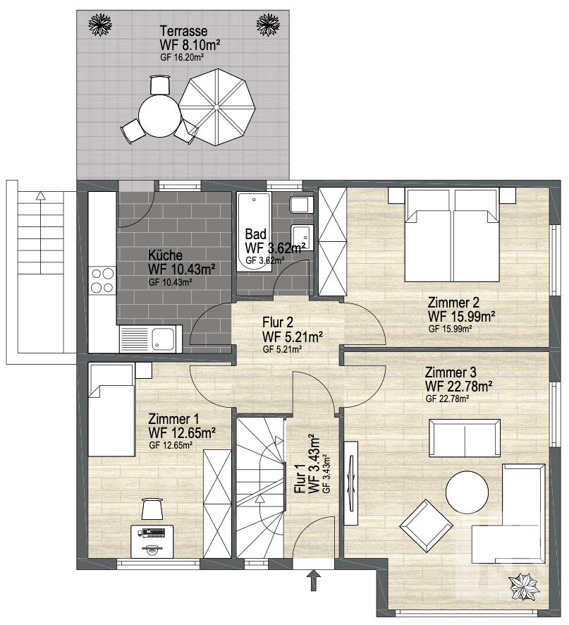 Das Erdgeschoss überzeugt durch eine helle und freundliche Wohnatmosphäre, die durch großzügige Fensterflächen unterstützt wird. Das Wohnzimmer bietet einen direkten Übergang zur Küche, von der aus Sie die überdachte Terrasse erreichen. Diese erweitert den Wohnraum ins Freie und bietet einen geschützten Platz für entspannte Stunden oder gesellige Abende. Ergänzt wird diese Ebene durch zwei Schlafzimmer sowie ein Badezimmer mit Badewanne und Dusche.
