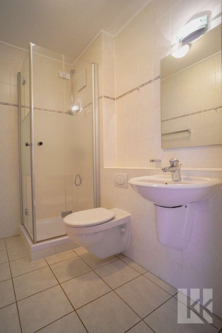 Zunächst erreichen Sie beim Betreten der Wohnung ein großzügiges Foyer. Der Blick fällt in die Küche… Abgetrennt aber angegliedert befindet sich daneben der mit circa 44 m² größte Raum der Wohnung – der Wohn- und Essbereich. Direkt daneben erreichen Sie das Gästebad mit Dusche.