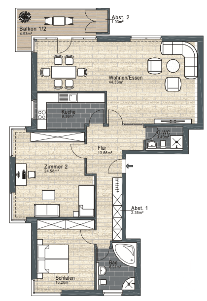 In diesem Teil der Wohnung kommt die Familie abends gerne zusammen um gemeinsame Zeit zu verbringen. Der Wohn- und Essbereich verfügt über einen direkten Zugang zum aussenliegenden Balkon, hier lassen sich die Sonnenstrahlen genießen und der nächste Grillabend mit Freunden wird definitiv bei Ihnen stattfinden.
