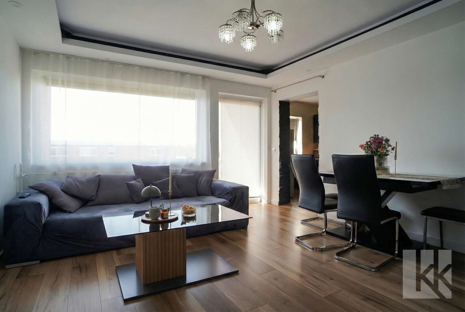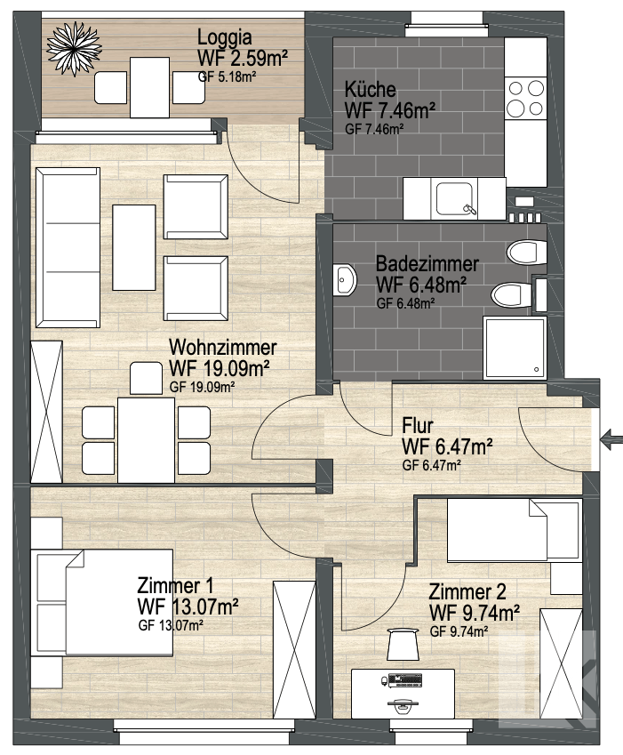 Das Wohnzimmer bildet mit rund 19 m² den zentralen Wohnbereich der Wohnung. Große Fenster sorgen für eine freundliche Helligkeit und bieten ausreichend Platz für eine gemütliche Sofaecke sowie einen kleinen Essbereich. Von hier aus gelangen Sie direkt auf die Loggia, die den Wohnraum nach außen erweitert und Platz für eine kleine Sitzgelegenheit bietet.