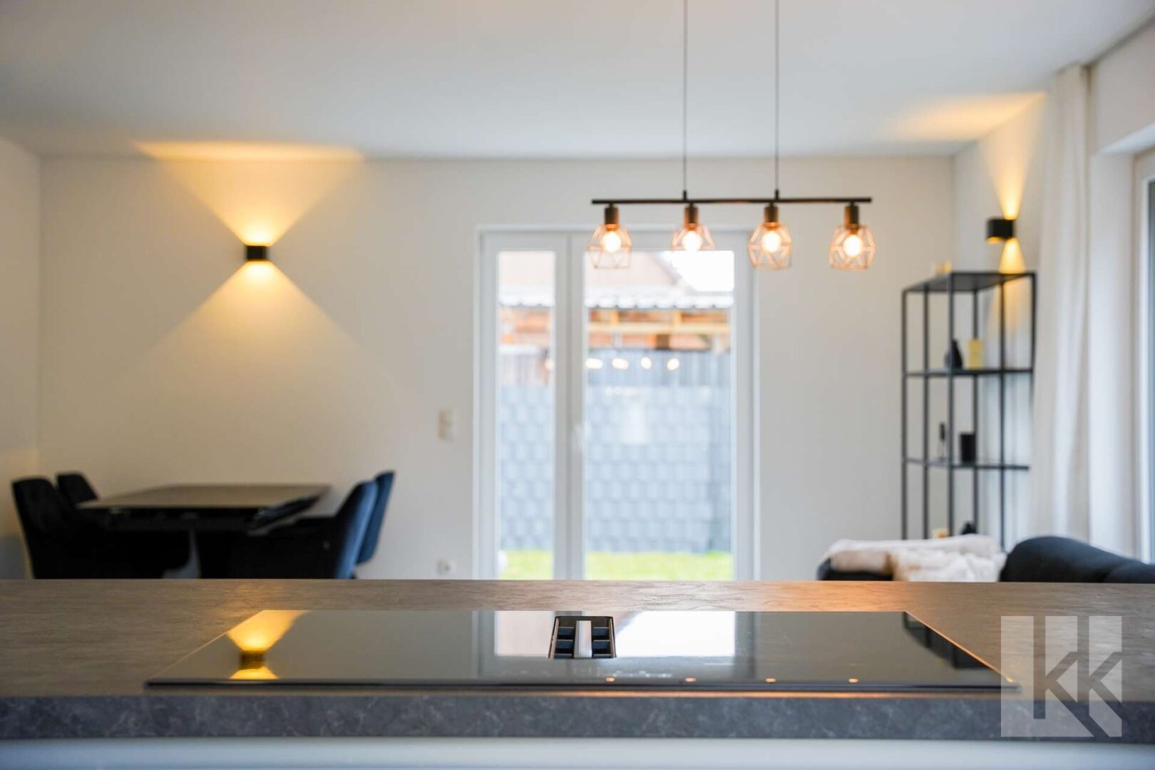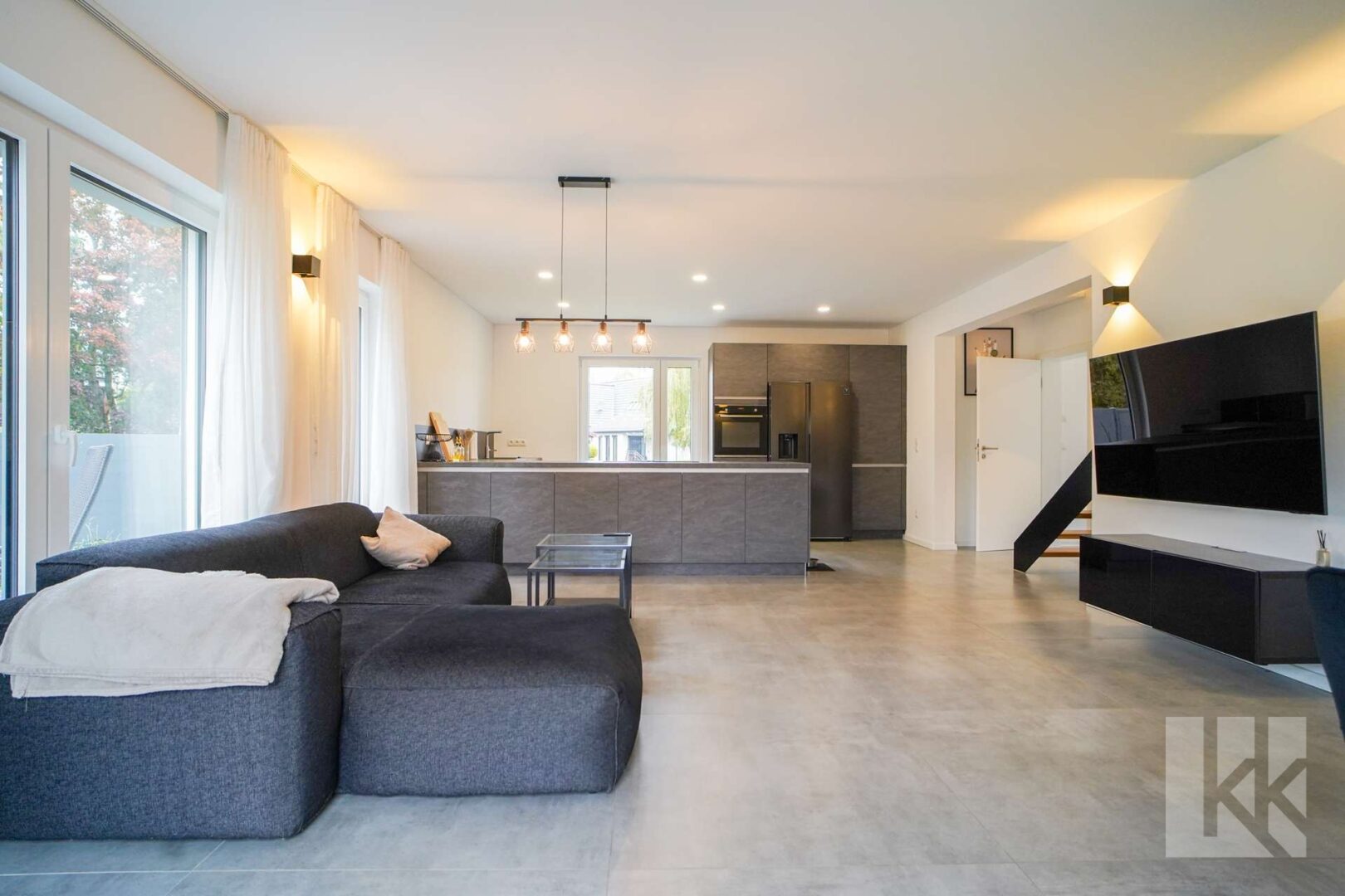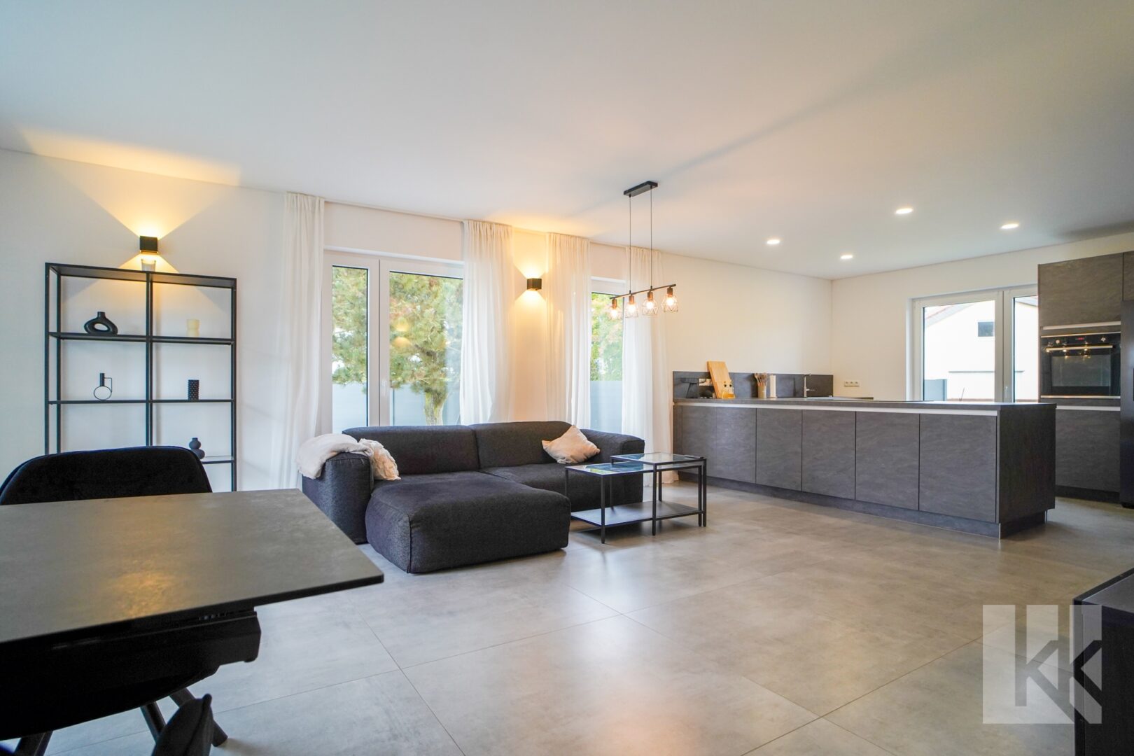 Der offen gestaltete Wohn- und Essbereich mit hochwertiger Einbauküche bildet das Herzstück des Hauses. Von hier gelangen Sie direkt auf die Terrasse und in den Garten – perfekt für gemeinsame Stunden im Freien. Der angrenzende Hauswirtschaftsraum bietet Stauraum und Zugang zu allen technischen Anschlüssen; über eine separate Tür erreichen Sie den Carport – ideal für kurze Wege beim Ankommen oder Einkaufen.