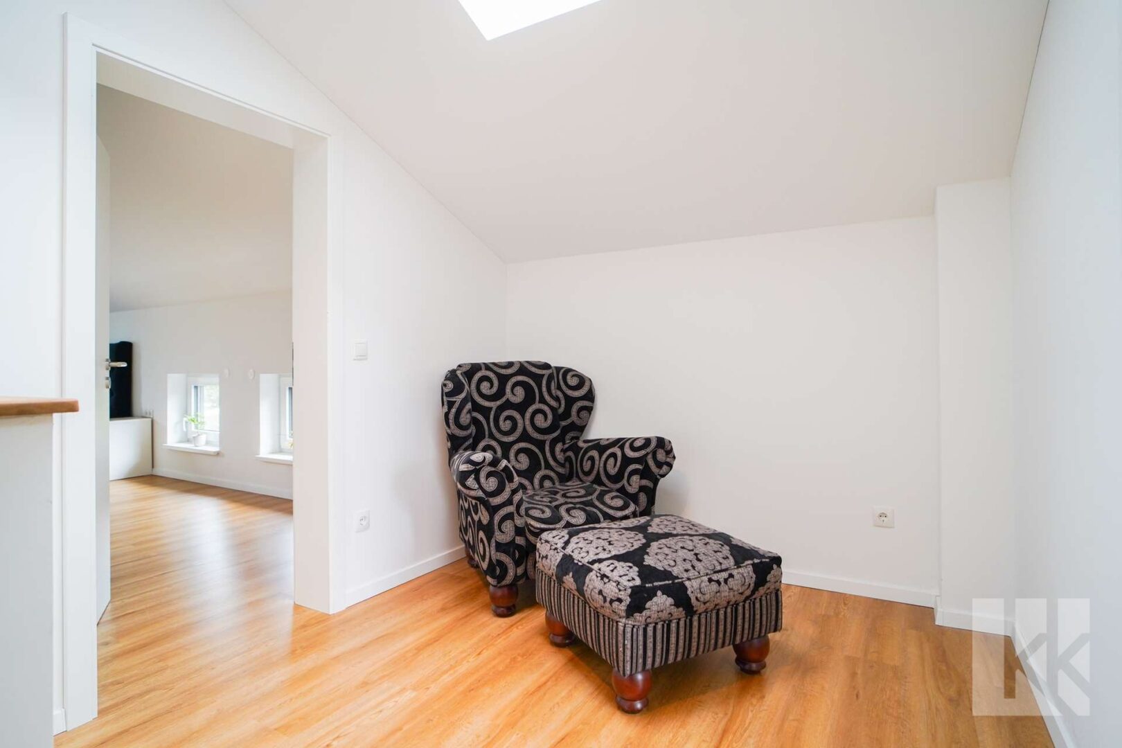 Eine elegante Treppe aus Eiche und Stahl führt in das Obergeschoss, das mit hohen Decken, großen Fensterfronten und einer offenen Galerie beeindruckt. Das stilvolle Badezimmer ist mit sandfarbenen, großformatigen Fliesen, Badewanne, Dusche, WC und Fenster ausgestattet. Das Elternschlafzimmer bietet eine entspannte Atmosphäre mit viel Licht, während zwei weitere Zimmer flexibel als Kinder-, Gäste- oder Arbeitszimmer genutzt werden können.