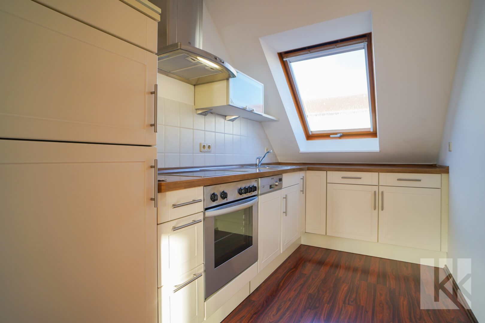 Die modernisierte Einbauküche aus dem Jahr 2022 ist kompakt, dabei jedoch intelligent aufgeteilt und optimal genutzt – effizient und stimmig in das Wohnkonzept integriert.